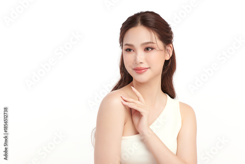 A beautiful young Asian woman with clean, fresh skin against a white background. Skincare, facial treatment, cosmetology, beauty, and spa. An elegant portrait of an Asian woman.