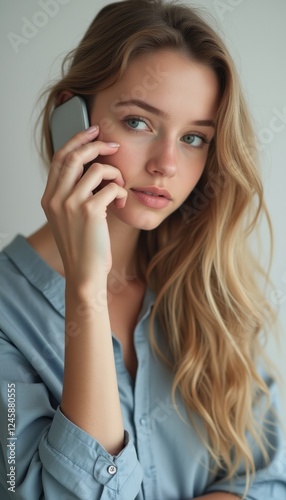 A beautiful young woman with long, flowing hair is engaged in a phone conversation, her expression reflecting deep thought. Dressed in a soft blue shirt, she exudes a calm and serene vibe, perfectly