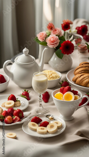 A beautifully arranged breakfast table with cereals, fresh fruits, and beverages under soft natural lighting. Includes strawberries, bananas, tea, coffee, and pastries, evoking feelings of morning rel