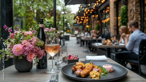 A beautifully arranged outdoor dining scene featuring a delicious gourmet meal, a bottle of rosé, and vibrant floral decorations in a charming atmosphere.