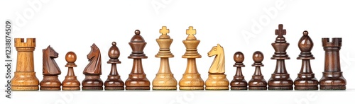 A beautifully arranged set of wooden chess pieces showcasing various designs and styles