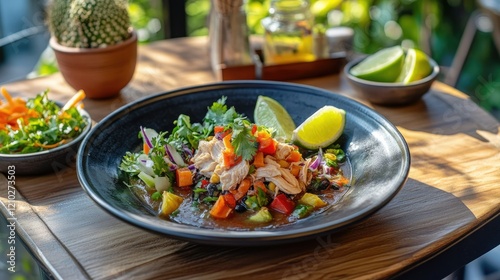 A beautifully arranged table featuring a plate of chicken taco soup, colorful vegetables, and a side of fresh lime wedges.
