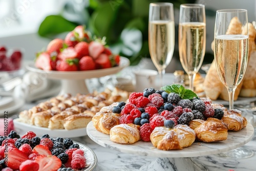 A beautifully arranged table featuring assorted pastries, fresh berries, and champagne, perfect for brunch or celebration.