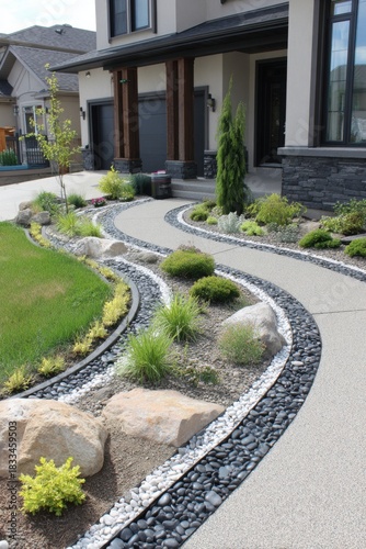 A beautifully curved pathway meanders in front of a contemporary house, adorned with stunning garden features and strategically placed rocks, all basking in the glow of daylight