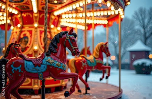 carousel, horse, winter, fairground, snow, twilight, festive, colourful, light, amusement, entertainment, evening, chilly, fun, attraction, joyful, ride, traditional, red, nostalgia, beautiful, scenery, decoration, whimsical, holiday, childhood, playful, leisure, family, wonderland, quaint, seasonal, charme, night, magic, life events, atmosphere, mood, gathering, enchanting, generative, ai