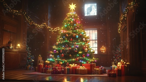 A beautifully decorated Christmas tree adorned with vibrant ornaments and gifts, set in a cozy, warmly lit room filled with holiday cheer.