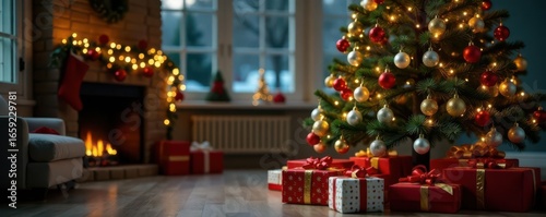 A beautifully decorated Christmas tree surrounded by a pile of gifts , abundance, season