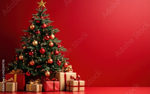 A beautifully decorated Christmas tree with red and gold ornaments, surrounded by wrapped gifts on a bright red background