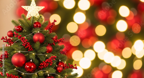 A beautifully decorated Christmas tree with red ornaments and a gold star against a warm bokeh background.