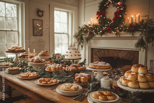 A beautifully decorated holiday table featuring an array of festive desserts, set in a cozy winter-themed dining room