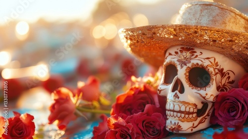 A beautifully designed sugar skull wearing a decorative hat rests among red roses, capturing the essence of a joyful cultural celebration