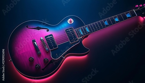 guitar, electric, music, instrument, string, string, bass, fretboard, wood, rosewood, maple, headstock, tuning, black, blue, purple, pink, vibrant, glow, light, bright, neon, body, bridge, neck, knob, volume, tone, jazz, rock, pop, acoustic, band, concert, stage, recording, session, melody, rythm, sound, artistic, design, detail, futuristic, modern