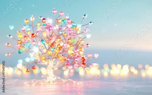 A beautifully illuminated tree adorned with colorful lights, creating a magical and enchanting atmosphere in a serene setting.