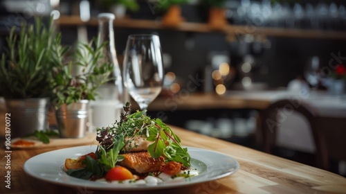 A beautifully plated dish with a mix of leafy greens, tomatoes, and grilled chicken, set on a wooden table in an elegant dining setting.