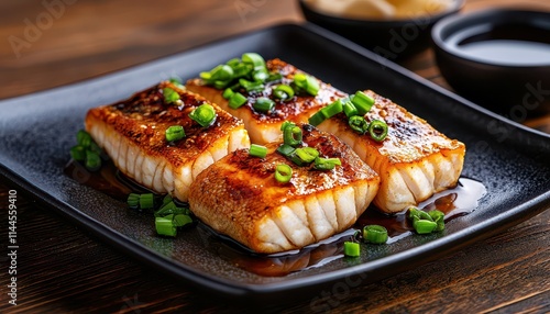 A beautifully presented dish of grilled fish, garnished with green onions, served on a black plate with dipping sauces in the background.