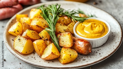 A beautifully styled plate of sausages, served with roasted potatoes and a side of mustard, garnished with fresh rosemary and thyme for a gourmet touch.