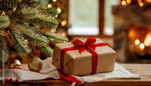 A beautifully wrapped Christmas gift sits beneath a decorated pine tree, adorned with twinkling lights, creating a festive and magical holiday atmosphere.