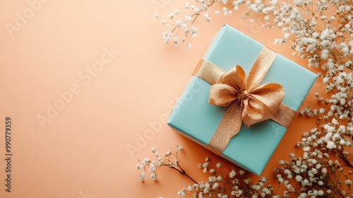 A beautifully wrapped gift box with a ribbon, surrounded by delicate flowers on a soft background.