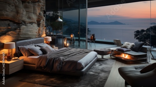 bedchamber, large, bed, view, ocean, domestic, room, indoor, luxury, modern, pillow, relaxation, comfortable, electric, lamp, night, home, interior, architecture, vacation, table, elegance, design, flooring, lifestyle, sofa, wood, material, people, hotel, holiday maker, resort, decor, window, dusk, apartment, travel, suite, summer, destination, illuminated, chair, wall, building, blue, living, ai, generative