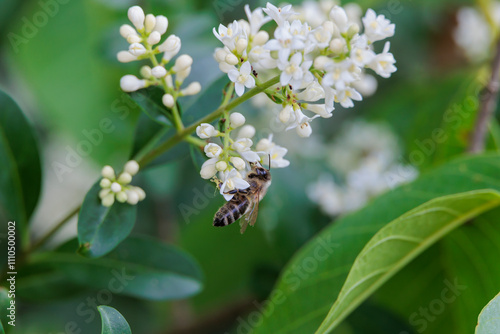 A bee collects nectar on the flowers of a privet bush