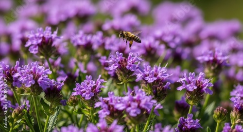 A bee hovers above a vibrant field of small purple flowers, collecting nectar in a sunny outdoor setting.