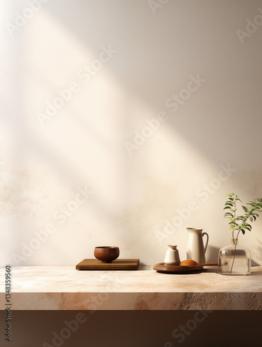 a beige wall with a light wood tabletop featuring a small plant and pots. a serene and elegant minimalist atmosphere, suitable as an e-commerce product background.