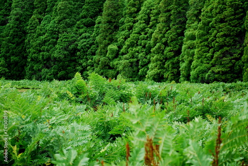 A big field of royal fern, Osmunda regalis, with cypress trees in the back, shot on Azores. Concept of green planet and nature.