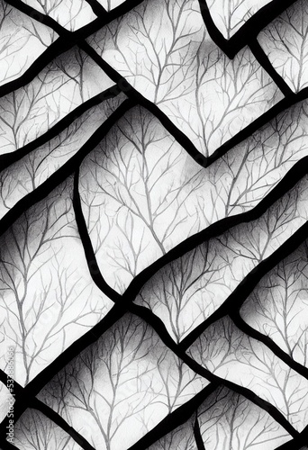 a black and white abstract pattern with leaves