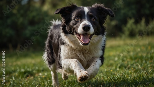 A black and white Border Collie running across a green meadow, with a joyful expression and small specks of dirt kicking up behind it.