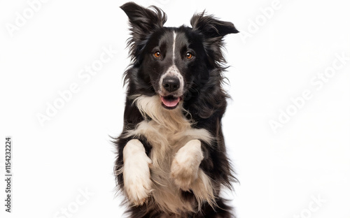 A black and white dog, possibly a Border Collie, in mid-air, seemingly jumping or leaping. The dog's front paws are raised, and its ears are perked up.