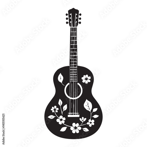 A black and white drawing of a guitar with a floral pattern silhouette White Background.