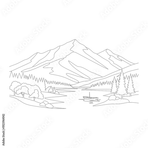 mountain, range, lake, tree, drawing, line, art, landscape, nature, scenic, black, white