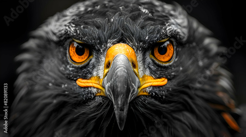 A black and white image of a bald eagle with selective coloring on its beak and eyes, emphasizing the bird's intensity and symbolism of freedom and courage on Memorial Day