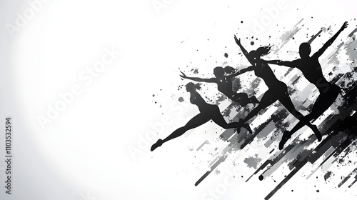 black, white, poster, woman, motion, jumping, silhouette, dynamic, energetic, air, experiencing, athleticism, sense, movement, dance, conveying, abstract, dancer, people, illustration, sport, young, vector, fitness, design, background, ink, art, splash, pose, music, disco, urban, festival, party, grunge, modern, beautiful, retro, entertainment, gymnastics, body, ballerina, ballet, paintbrush, shape, action, paint, active
