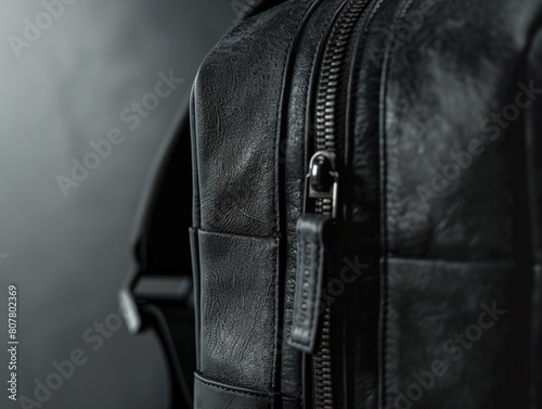 A black briefcase or backpack with a textured zipper front pocket, ideal for storing essentials. Its sleek, well-used appearance adds character to any background or wallpaper.