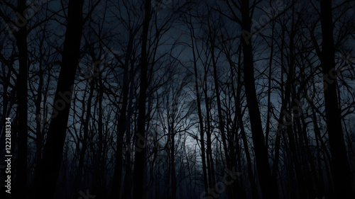 A black canvas featuring faint outlines of tree branches and leaves, softly illuminated by a hidden light source, giving an eerie yet serene nighttime forest vibe.
