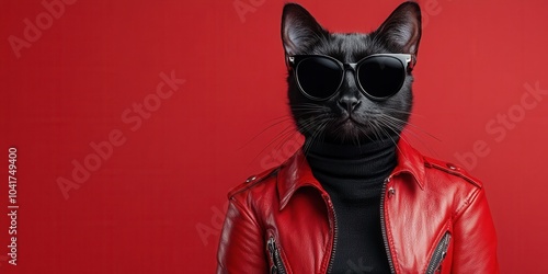 A black cat confidently posed in stylish sunglasses and a striking red leather jacket, set against a bold red background. Its distinctive look showcases a playful yet fashionable demeanor, capturing a