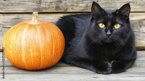 cat, pumpkin, orange, halloween, black, autumn, pet, yellow, eye, whisker, wood, grain, surface, gourd, stem, harvest, cute, animal, felino, sleek, fur, lay, relaxing, domestic, curious, season, holiday, skittish, light, texture, background, nature, close, calm, sharpened, front, view, soft, detail, fall, warmth, still, pose, shape, round, vibrant