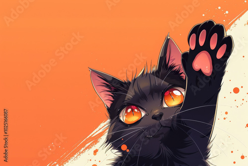A black cat with orange eyes is shown with its paw raised in the air