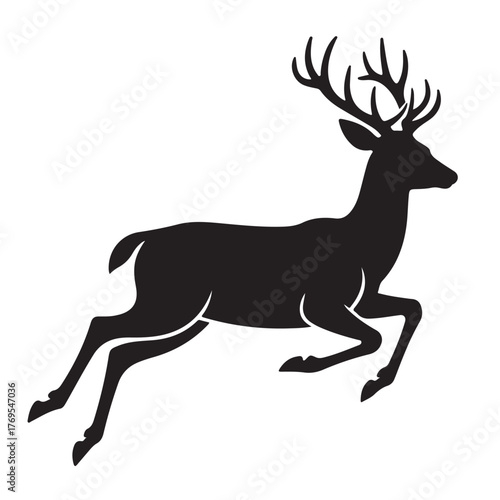 A black silhouette of a leaping deer with antlers isolated on white background, embodying grace and wild beauty in motion