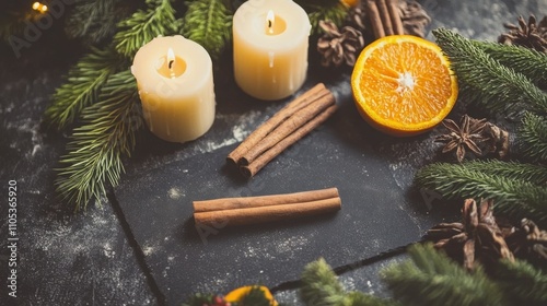 A black table with candles, cinnamon sticks, and an orange