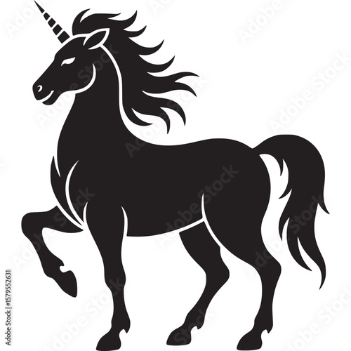 unicorn, black, white, vector, illustration, horse, mythical, creature, animal, magic, fantasy, horn, mane, tail, hoof, standing, leg, silhouette, graphic, design, clip art, symbol, icon, art, drawing, equine, fast horse, mare, pony, mythology, legend, fairy, tale, equestrian, mystical, heraldic, heraldry, elegant, graceful, isolated, simple, artwork, monochrome, 1, single, rearing