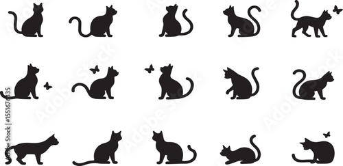 A black vector illustration set of cartoon cat and animal silhouettes, perfect for Halloween pet designs