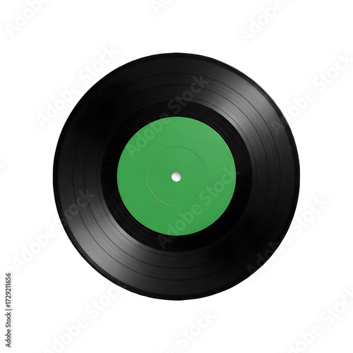 A black vinyl record with a green label isolated on a transparent background, representing music and nostalgia