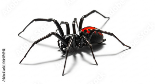 A black widow spider with its iconic red hourglass marking on its abdomen isolated on a white background.