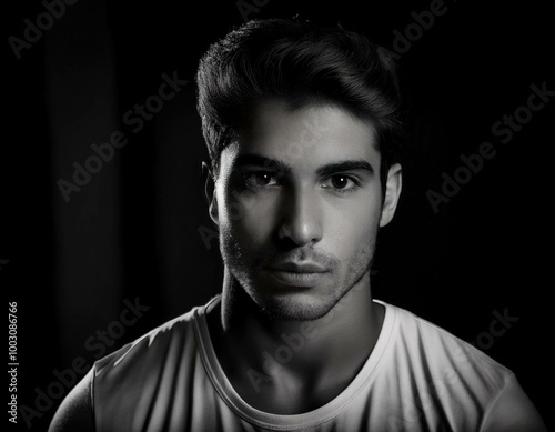 portrait, forehead, chin, eyebrow, jaw, neck, eyelash, beard, eyewear, monochrome, facial hair, t-shirt, darkness, fashion model