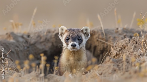ferret, animal, peeking, burrow, grass, wildflower, nature, curiosity, innocence, wildlife, furry, small, exploration, environment, serene, habitat, texture, earthy, inquisitive, cute, gold, soft, detail, natural, peaceful, alert, fauna
