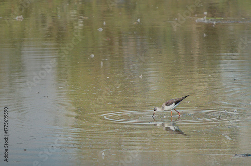 A Black-winged Stilt (Himantopus himantopus) in the water - Cigueñuela - Shallow waters of Fuente del Rey Lagoon, Seville, creating gentle ripples as it searches for food