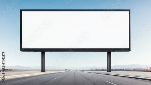 A blank billboard stands beside an empty road under a clear blue sky, ready for advertising opportunities.