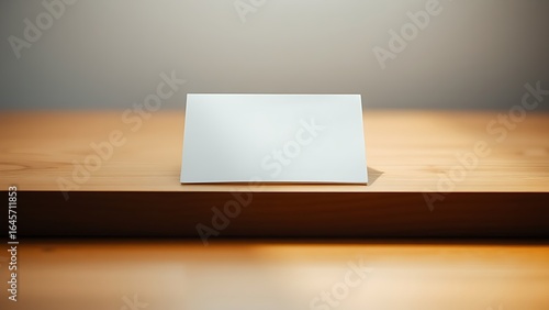 A blank notecard placed on a wooden desk with soft diffused lighting and shallow focus.